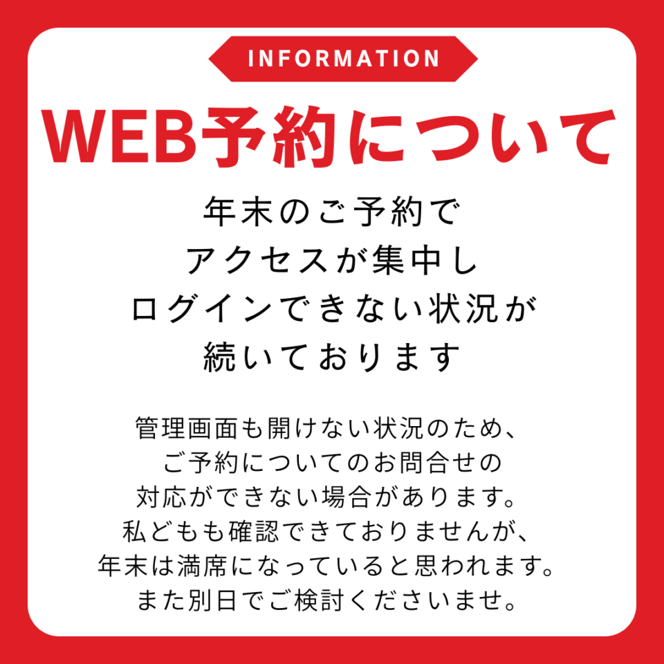 年末のご予約は満席になっていると思われます。 何度もログインされるとアクセスの集中が続き、復旧に時間がかかりますので、 また別日で予約を検討いただけますようお願いいたします。