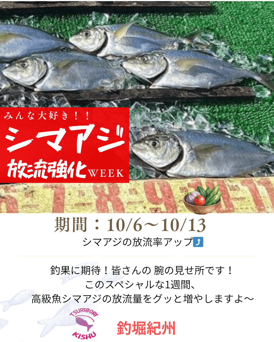 【シマアジ放流強化🔥WEEK🔥】 10月6日から10月13日までの1週間開催! みんな大好き! シマアジの放流率を、通常よりUP⤴️ 強い引きが魅力の高級魚 シ … 続きを読む シマアジ放流強化Week! 10/13まで