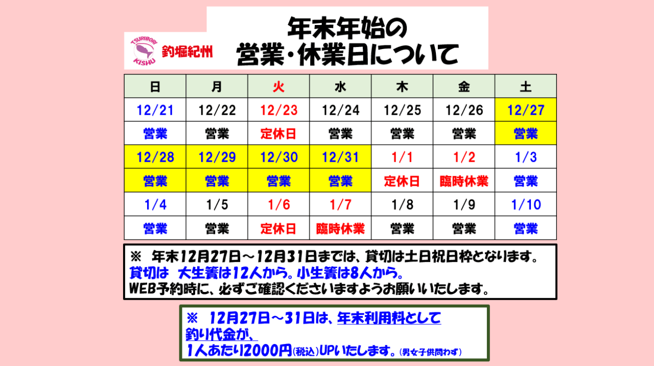 また、12月27日~12月31日の期間中は、釣り代金と別に