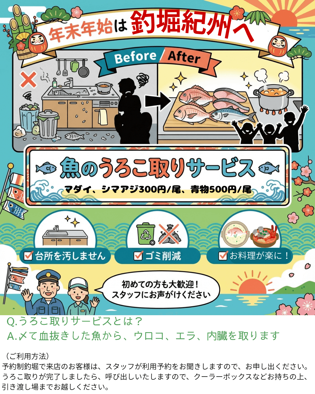 年末年始の魚釣りで、こんなお悩み、ありませんか? □ 台所が『うろこ』だらけになるのがイヤ □ 魚の下処理、実は苦手…。処理の仕方がわからない □ 年末年始はゴミの収集期間があくのでゴミが出せない □ せっかく掃除した台 … 続きを読む 魚の『うろこ取り』サービスについて~年末年始編~