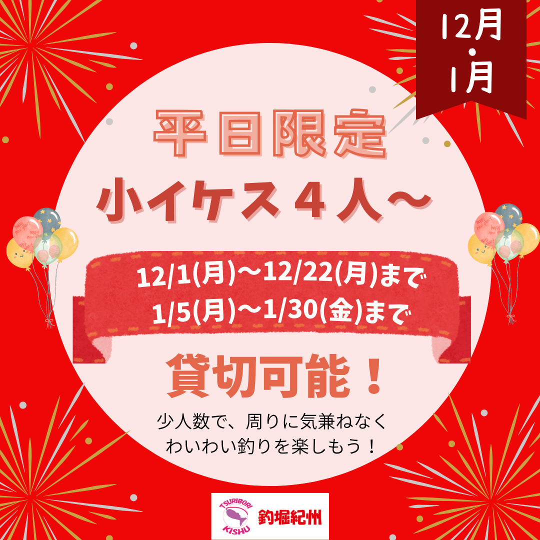 いつも釣堀紀州をご利用いただき、誠にありがとうございます。 ご要望の多かった少人数でのイケス貸切プランを、12月・1月も平日限定で実施いたします! 🐠 プラン概要 対象イケス: […]
