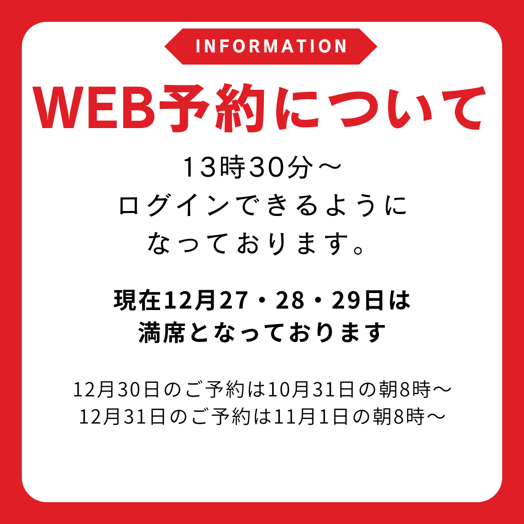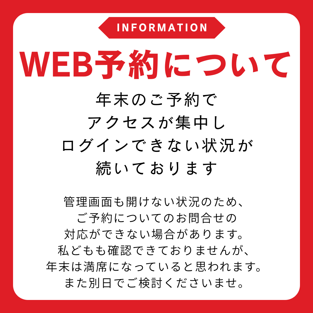 年末のご予約は満席になっていると思われます。 何度もログインされるとアクセスの集中が続き、復旧に時間がかかりますので、 また別日で予約を検討いただけますようお願いいたします。 11月や12月前半のご予約や変更については、