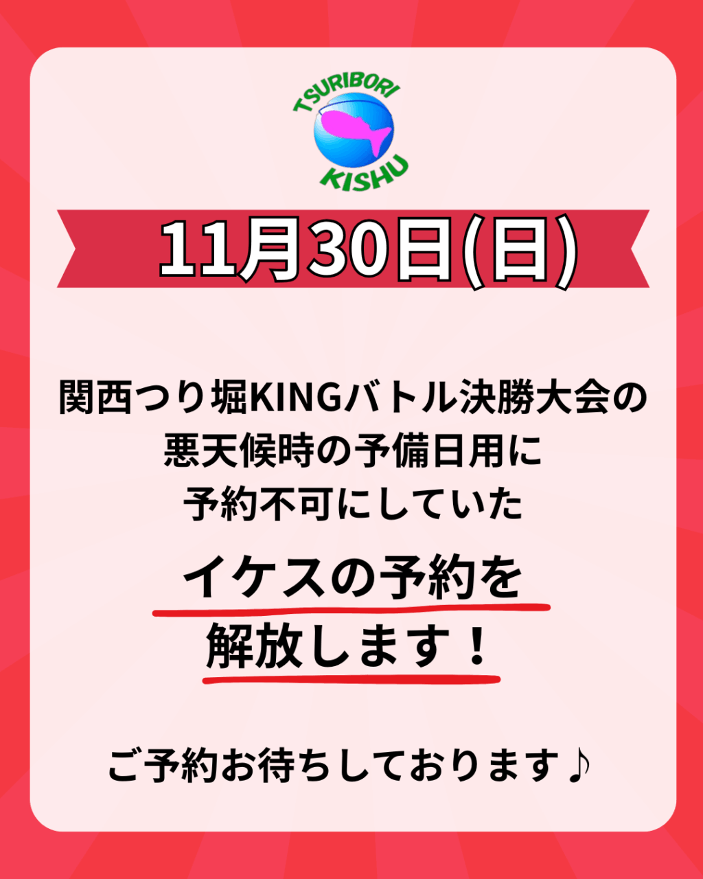 📢 朗報!11月30日(日)のイケス予約を解放します!🎣 お待ちかねの皆様、お待たせいたしました!🙇♀️🙇&#x
