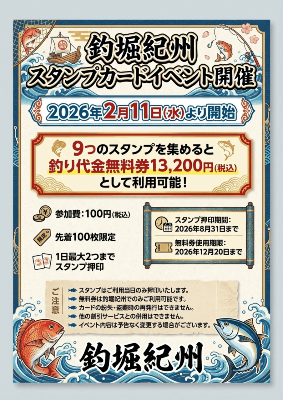 📅 開催期間 2026年2月11日(水)より開始 ✨ イベント概要 釣堀紀州では、お客様への感謝の気持ちを込めて、 スタンプカードイベントを開催いたします! 🎯 特典内容 9 […]