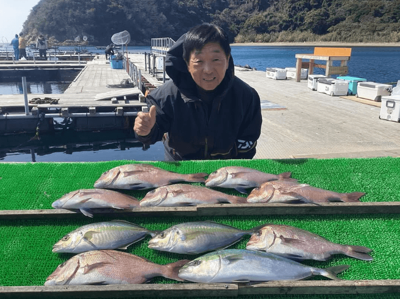 🍀 3月12日 釣堀紀州🍀 水温 下:15.0℃ 上:15.3℃ 今日の釣果写真です🐠 ①柴原さん マダイ7 シラサエビ・マダイイエロー・キビナゴ/6ヒロ シマアジ2 マ